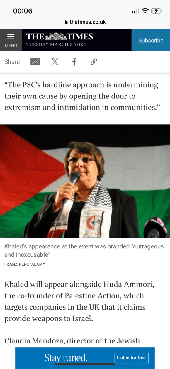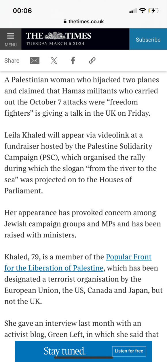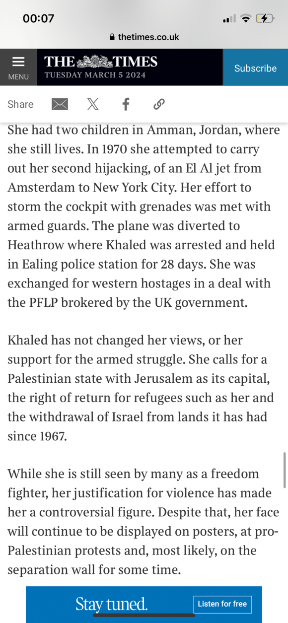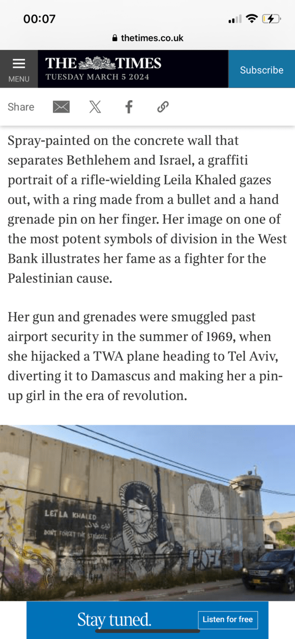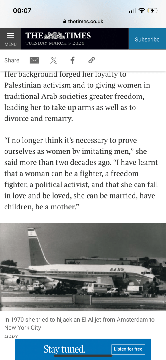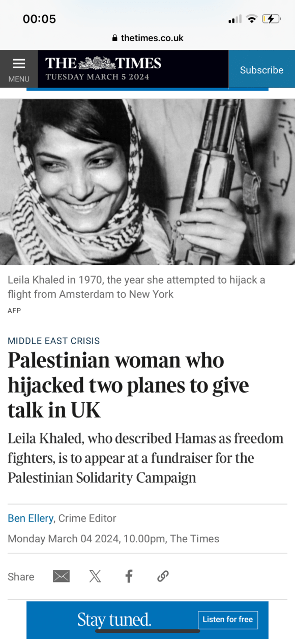 Categories Uncategorized Leila Khaled – Wikipedia Post author By Pete's Library Post date March 6, 2024 No Comments on Leila Khaled – Wikipedia Leila Khaled – Wikipedia — Read on en.m.wikipedia.org/wiki/Leila_Khaled Share this: Share on X (Opens in new window) X Share on Facebook (Opens in new window) Facebook Like Loading... ← Palestinian woman who hijacked two planes to give talk in UK; Leila Khaled → Politician watch: Liz Kendall Leave a comment Cancel reply Δ