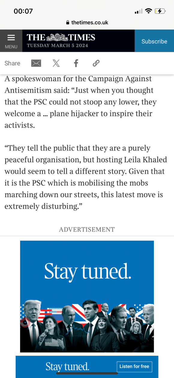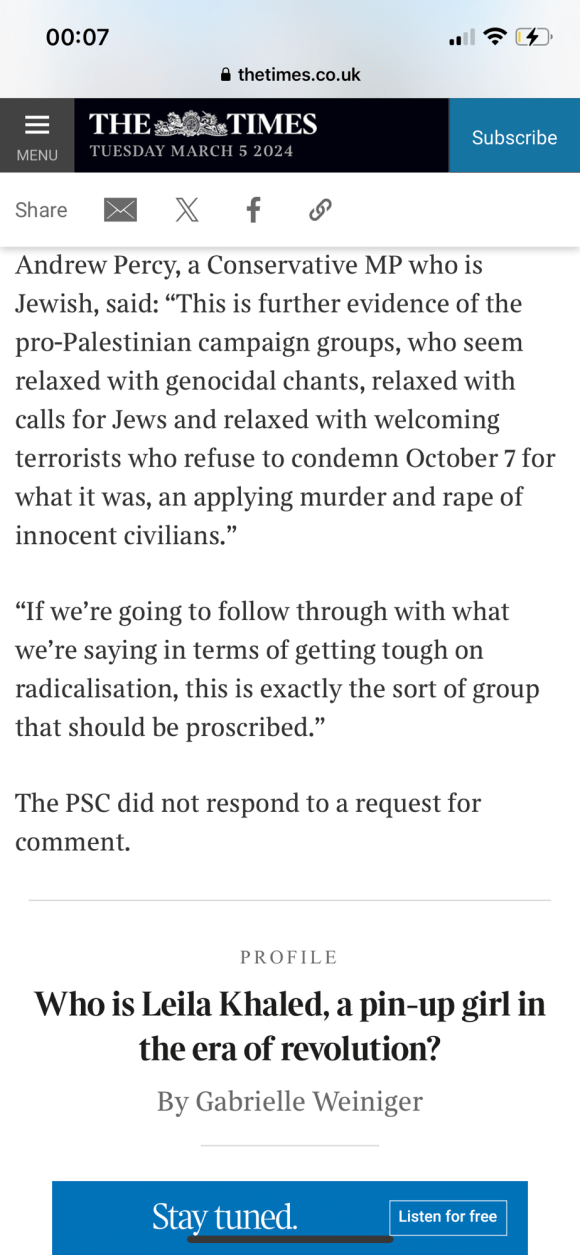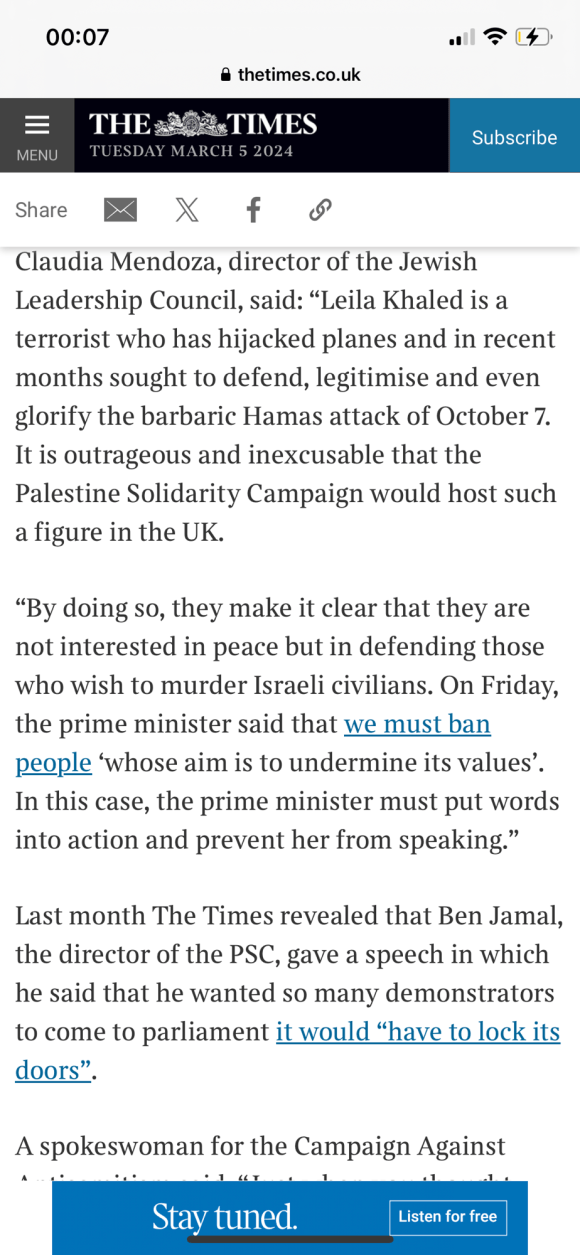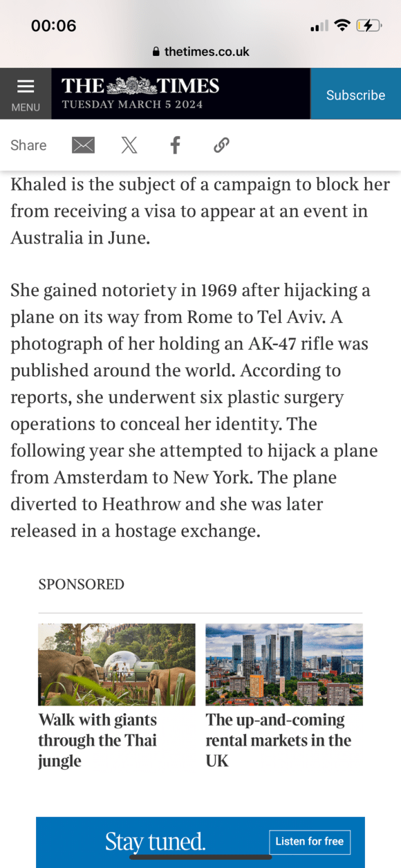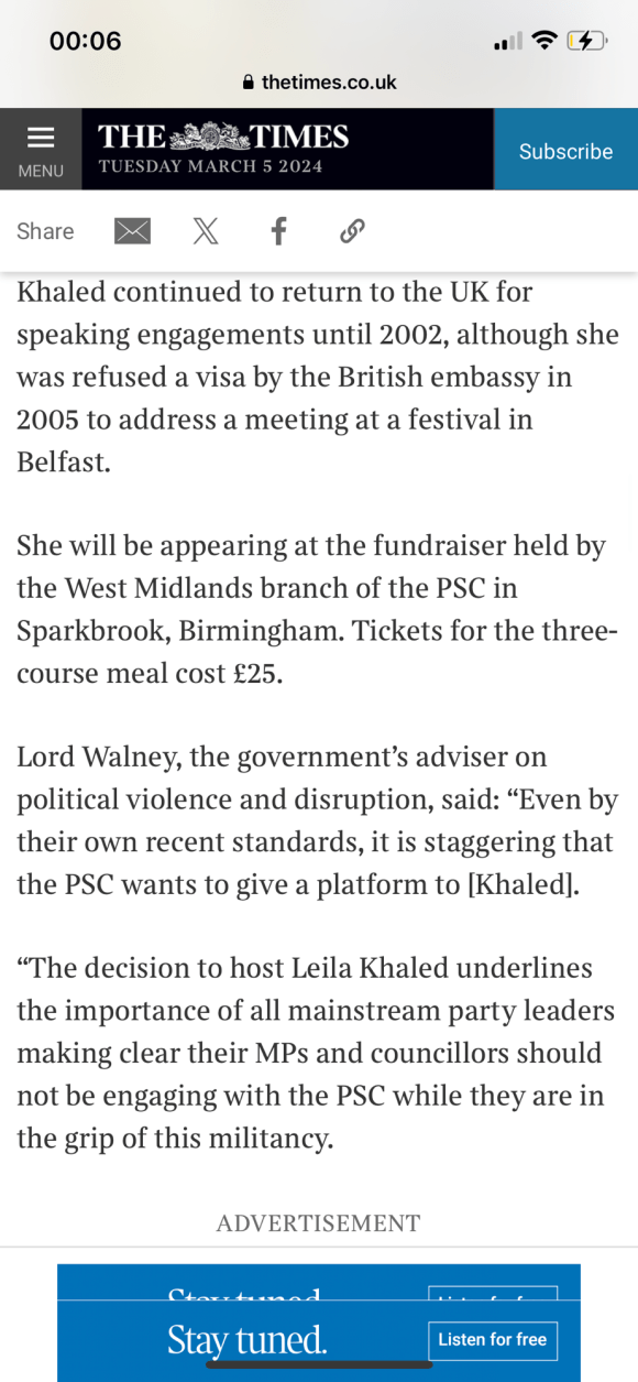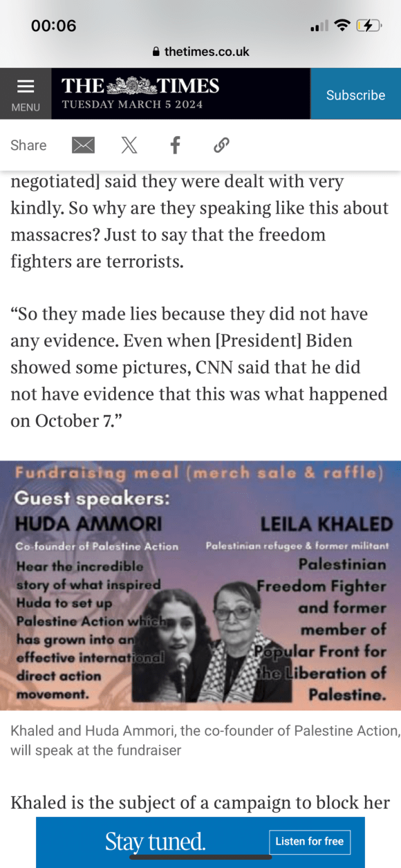 Categories Uncategorized Leila Khaled – Wikipedia Post author By Pete's Library Post date March 6, 2024 No Comments on Leila Khaled – Wikipedia Leila Khaled – Wikipedia — Read on en.m.wikipedia.org/wiki/Leila_Khaled Share this: Share on X (Opens in new window) X Share on Facebook (Opens in new window) Facebook Like Loading... ← Palestinian woman who hijacked two planes to give talk in UK; Leila Khaled → Politician watch: Liz Kendall Leave a comment Cancel reply Δ